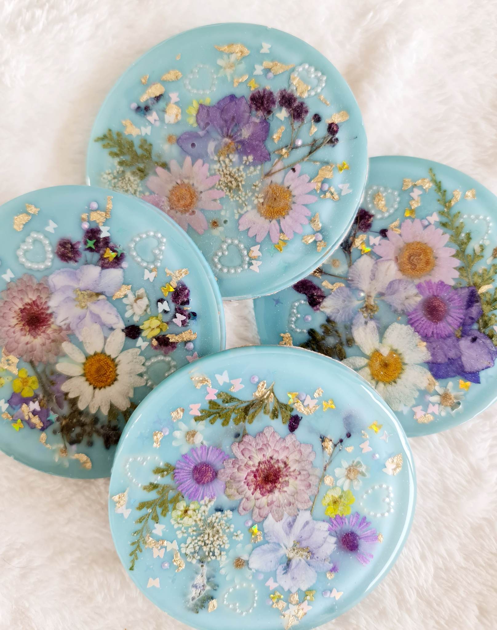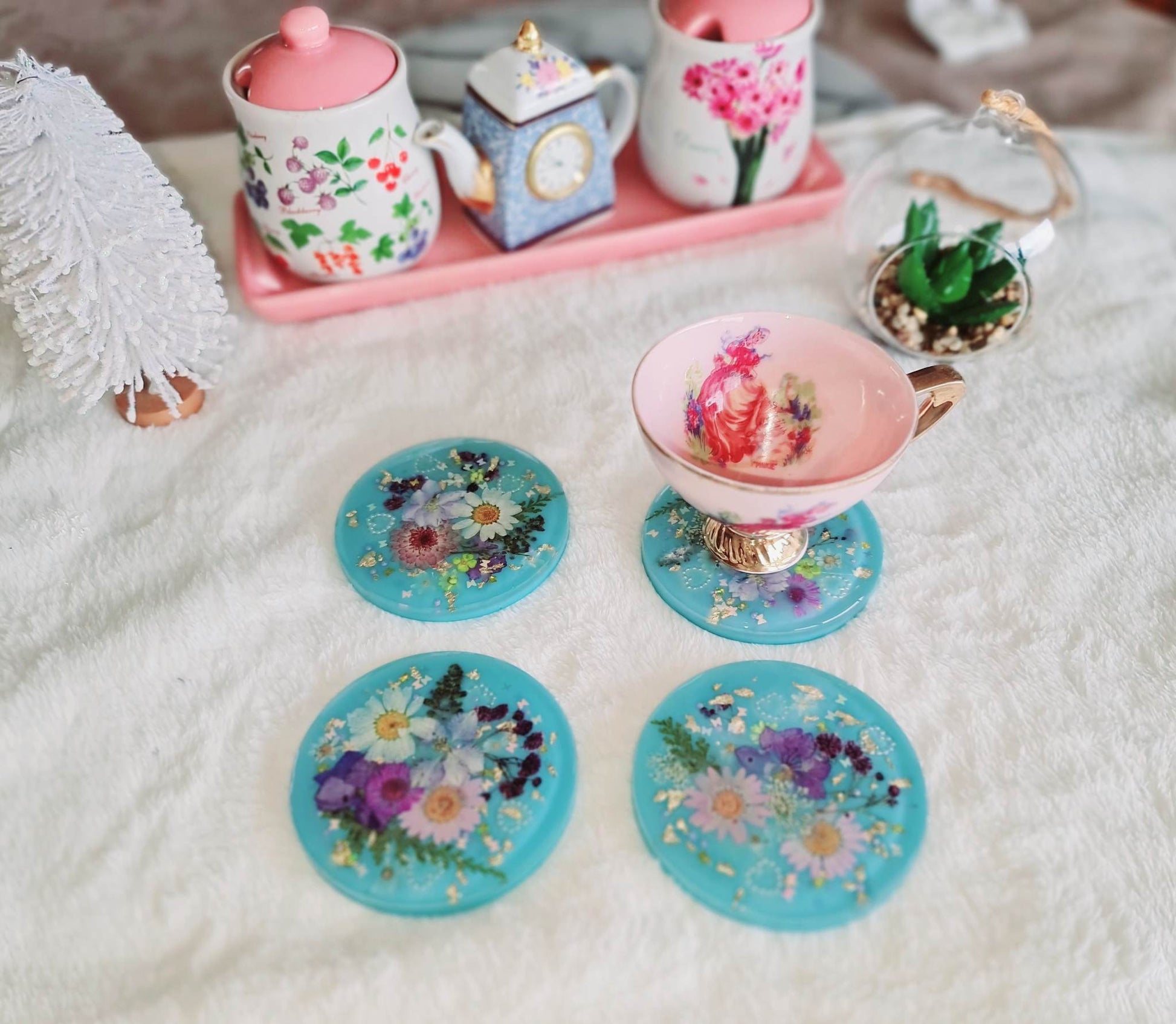 Made of high quality epoxy-resin with real dried flowers and leaves and a few tiny bits and pieces to add a perfect touch of nature to your coffee table or desk.